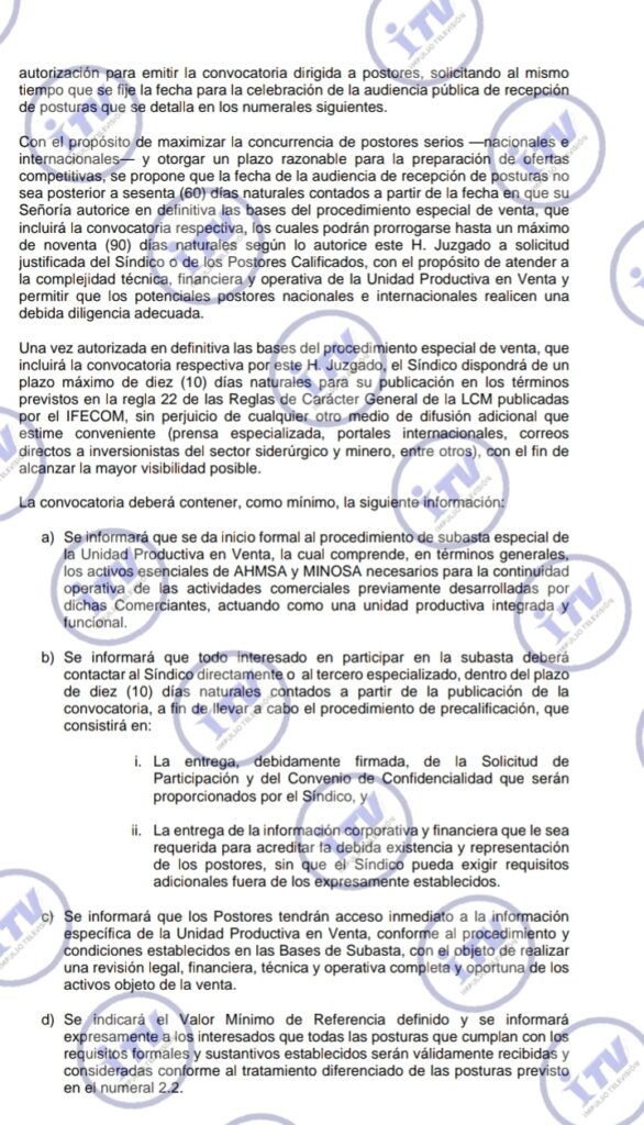 El síndico Víctor Manuel Aguilera Gómez presenta un esquema integral para subastar AHMSA y MINOSA pero, sin una fecha exacta pues pudiera ser después de 90 días según las bases que presentó en el juzgado.