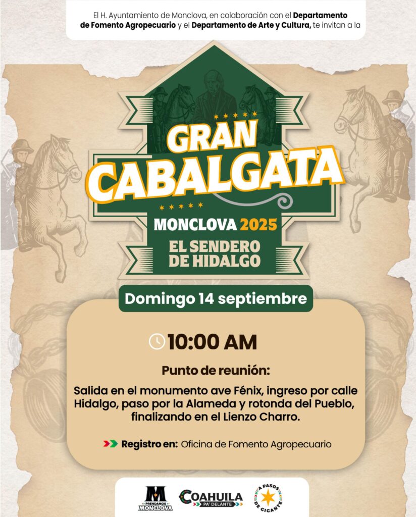 Las festividades inician el sábado 13, con una celebración en la Plaza Principal por el 215 aniversario de la Independencia de México, el domingo 14 de septiembre se tendrá una cabalgata conmemorativa del Sendero de Hidalgo, que partirá a las 10:00 horas desde el Monumento del Ave Fénix, recorrerá la calle Hidalgo, la Alameda, el Museo Coahuila y Texas, y culminará en el Lienzo Charro. Ahí, los participantes disfrutarán de una convivencia que incluirá comida y rifas.
