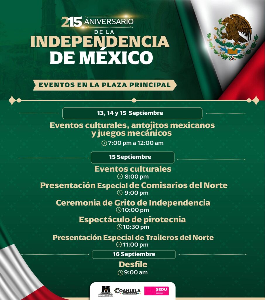 El 15 de septiembre a partir de las 19:00 horas, la Plaza Principal será el escenario de eventos culturales, juegos mecánicos, antojitos mexicanos y la participación de la banda de guerra monumental integrada por más de 150 jóvenes, bajo la dirección del 105 Batallón de Infantería. La noche culminará con la ceremonia del Grito de Independencia, un show de pirotecnia y el concierto de los Traileros del Norte.