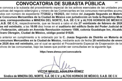 La venta en bloque busca liquidar deudas laborales y reactivar la producción El Juzgado Segundo en Materia de Concursos Mercantiles fijó el próximo 27 de febrero de 2026 para la subasta de Altos Horno...