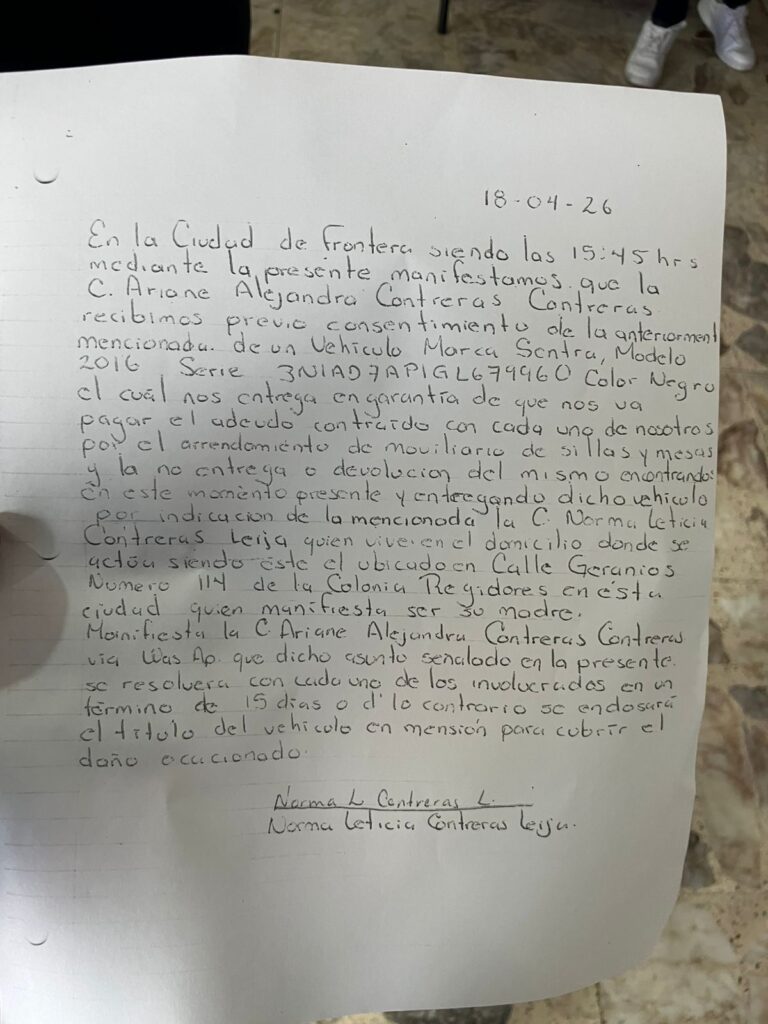Antes de llegar a las autoridades, las víctimas intentaron resolver el conflicto por la vía del diálogo. Incluso, la madre de la acusada intervino ofreciendo un vehículo como garantía de pago en un acuerdo escrito a mano. Sin embargo, las promesas se quedaron en el papel y el auto nunca fue entregado, lo que obligó a los perjudicados a buscar el amparo de la Fiscalía General del Estado.