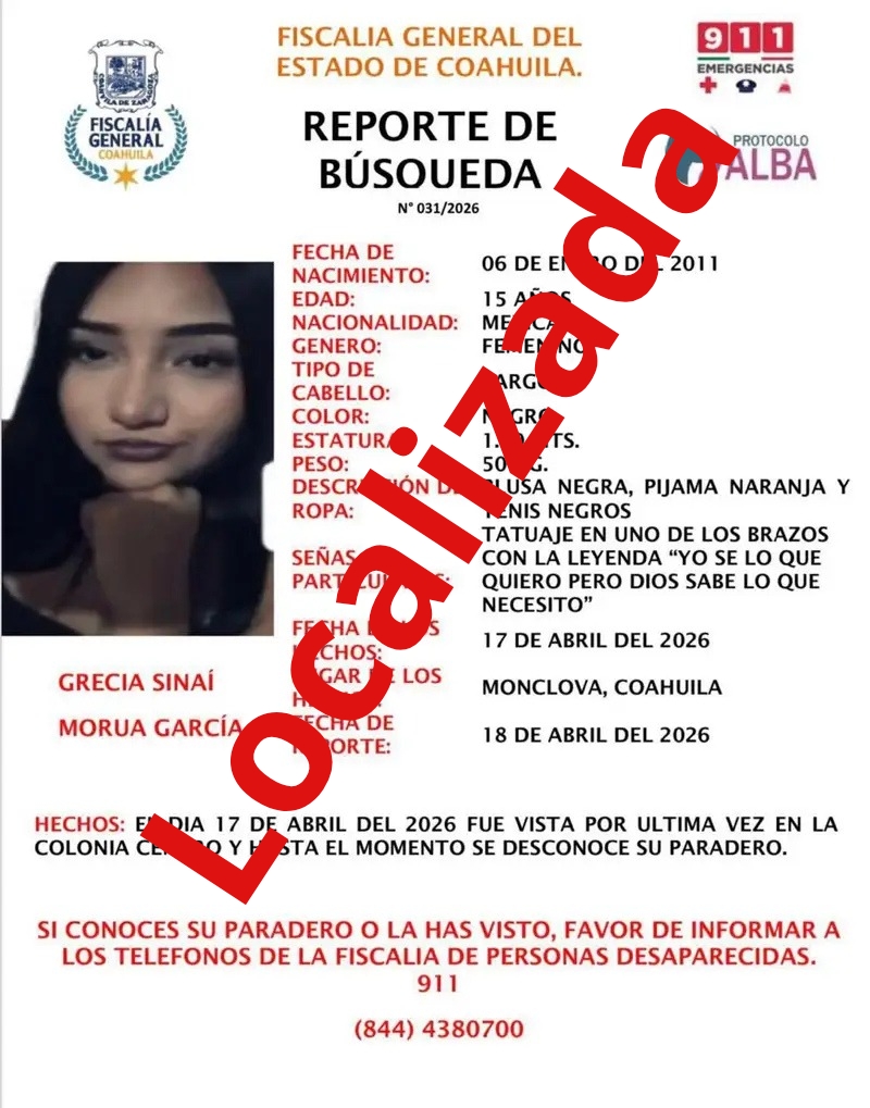 ​Grecia Morua, una menor de edad que había sido reportada como desaparecida en Monclova, fue localizada con vida. José Ángel Herrera, fiscal de personas desaparecidas en Coahuila, informó que la joven ya se encuentra de regreso con su abuelo, quien funge como su principal responsable y red de apoyo familiar.