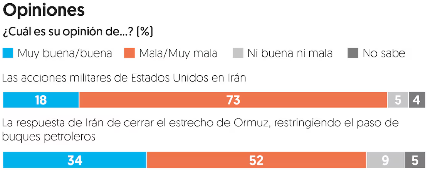 Sobre la respuesta de Irán, como el cierre del estrecho de Ormuz, las opiniones están divididas. Aunque algunos lo ven como una medida válida, más de la mitad lo desaprueba, al considerar que afecta el comercio y puede agravar el conflicto económico a nivel mundial.