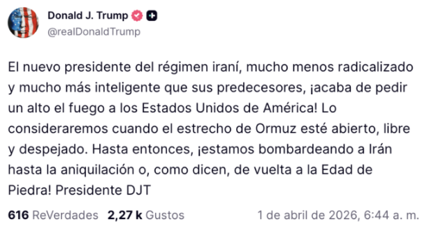 A través de su red social, el mandatario aseguró que las operaciones continúan con fuerza y advirtió que podrían mantenerse hasta debilitar por completo a Irán. Sus declaraciones han generado preocupación por el tono, ya que habló de llevar el conflicto a un nivel extremo si no se cumplen sus exigencias.